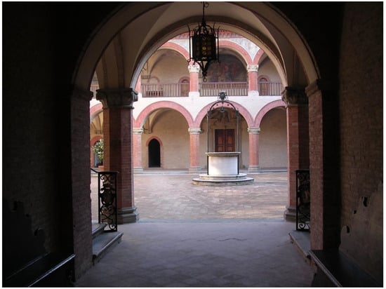 Interior view of the Porticum and Loggia of the Royal Spanish College at the University of Bologna.