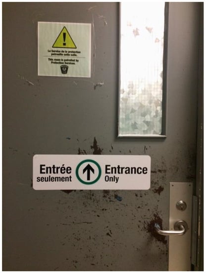 The people using the space have done their best to make it homely and welcoming—it is carpeted, has shoe boxes at the entrance, bookcases with beautiful copies of the Koran, and a blackboard that has been covered in prayers and inspirational quotes and sayings. Architecturally, however, the space is sub-par. It has a dropped acoustic ceiling, making any chanted prayers fall dead to the carpeted floor, and strip neon light tubes that cast an equally deadening, white glare. Worst of all, leading to the space is a dinged and beat-up metal door, covered in warning-stickers, that looks like it belongs in a prison rather than leads to a sacred space (Figure 6). The fact that this space is visibly Muslim also, of course, means that it would not be a comfortable space for a Jewish or Christian student or a Sikh, Hindu, or Buddhist student to practice their religion. These other groups, by no means unrepresented on campus, are therefore denied sacred space, as, of course, is the large but uncounted contingent of those who count themselves among the Spiritual but not Religious.