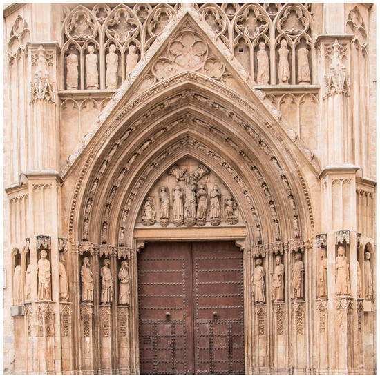 However, there are still certain controversies in relation to the builder’s education, oral transmission, techniques and knowledge, as well as constructive geometry (geometria fabrorum) (Serra 2012, p. 167). Professionals’ artistic mobility between states, the attraction of cities’ economic power and the protection afforded mostly by influential patrons is considered to be of vital importance for the exchange of knowledge and techniques. This occurred with the traffic among the builders of the western doorways of Nôtre Dame cathedral in Amiens and their move to the capital of Paris, hired to carry out minor works, and in the case of the builders in the Cathedral of Santa María de Regla in León who moved to the cathedral of León in Spain, while others went to work in Reims. (Williamson 1997, pp. 221–26). Specifically, at the end of the 14th century and the beginning of the 15th, Valencia established relations with the territories of the Crown of Aragon, as well as with Murcia and Andalusia (Gómez-Ferrer 1997–1998, p. 92). Despite not having any document to date to certify the authorship of the doorway of the Apostles, its formal style resembles the Gothic doorways of France. Various studies, such as the work dedicated to heraldry that appears on the cover, establish starting points for its chronology (Rodrigo 2013, p. 18), but none question the predominantly classic Gothic nature from the French school.