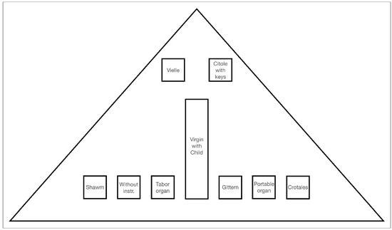 Diagram of the location of the instruments of the angelic musicians represented on the Door of the Apostles. By the author.