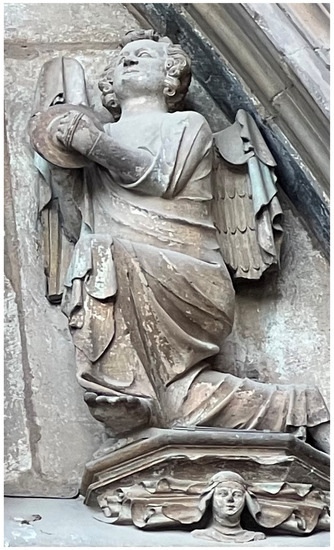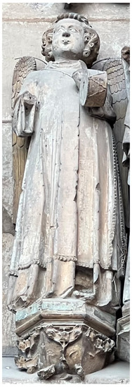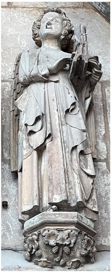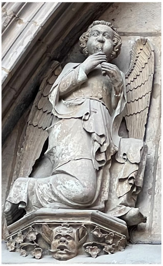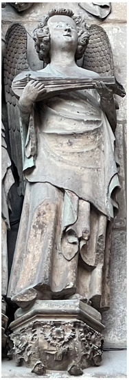 Today, we can see the image in stone of the Virgin standing with the Child in the centre of the tympanum, the latter holding an open book in his left arm, surrounded by angels playing music (Figure 4): to their right and left there are three angelic musicians either side, while above, flanking her head, there are two more, one on each side: “The 13th century marks the beginning of the success of the iconographic type of musical angel and its presence in monumental art” (Perpiñá 2018, p. 92). But the arrangement of the scene was different until 1599, as has been explained above, when the order was given to saw off the mullion, like the one in the Palau doorway and as happened with other Gothic doorways such as the one in Murcia’s Cathedral and Notre Dame, as revealed by sources from the Cathedral’s archive and which Sanchís y Sivera sheds light on (1909) (ACV sign. 1390, fol. 30r, 1599). In that image, the Virgin with Child rested on the central column “that is in the middle of the Doorway of the Apostles […]” (ACV sign. 1479, fol. 28r, 1431) and above that image, as described by the documentary sources, the musical angels or “sound-producing angels who are above said Doorway of the Apostles […]” (ACV sign. 1479, fol. 31r, 1431). In “[…] the Old Testament there is no explicit reference to the music of angels. Something similar occurs in the case of the New Testament […] there are apocryphal, liturgical and patristic sources that show that, at least as of the fourth century (and in some cases even earlier), the concept of angelic music was already present in certain Judeo-Christian sectors and in the early Church, especially in the eastern area” (García Mahíques 2018, p. 22). But there are mentions of praising God through musical instruments, as in the Book of Psalms (Ps 149, 1–3; Ps 150, 3–6). However, we cannot find an exact correspondence in the Psalm of Praise of King David (Ps 150, 3–6) with the angelic musicians’ musical instruments on the Doorway of the Apostles in the Cathedral of Valencia (Figure 5). The Psalm mentions a trumpet, a flute, a harp, a drum, a harpsichord, an organ, a zither and cymbals. Assuming that the one-armed angel on the Doorway of the Apostles, as will be explained later, is playing an instrument of medieval tradition such as a psalter, harp, rattle, triangle, etc., matching one named in the psalm, the trumpet does not appear in the Cathedral’s Doorway, nor do the cymbals as such, but rather they are finger cymbals. The drum and flute that are named in the psalm as individual instruments are considered on the Cathedral’s Doorway to be one instrument known as a tabor, which is being played by the same instrumentalist at the same time. The organ does match: it appears both in the literary source and in the visual theme of the angels, though the psalm makes no mention of the gittern or medieval guitar, the citole, the vielle or the shawm seen in the angelic hands of these characters.