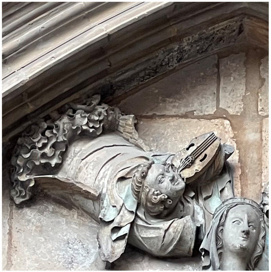 The period when the Door of the Apostles was built was the musical period straddling the Ars Antiqua and the Ars Nova, that is, when musical notation systems were developing due to the need to annotate to meet the demands of compositions. The progress in polyphony would take place mainly in the ecclesiastical institution, also fostered by the creation of nobles’ private chapels as of the 14th century: “The history of Western medieval music, at least during the first millennium of our era, must necessarily be a history of Christian liturgy” (Hoppin 2000, p. 45). Sacred polyphony would need performers versed in the musical notation that had evolved. However, the equally rich instrumental repertoire would continue to be based on oral tradition to a great extent. In this sense, the minstrels were to be a fundamental professional group in medieval society, about which literary and iconographic sources reveal a great deal of information. Iconic visual arts scenes provide considerable documentation of medieval organography. The various instruments represented confirm the technical evolution of the instrumentalists, and hence the development of guilds of instrumental craftsmanship, as well as the importance of cultural exchange in developing organography and performance thanks to the mobility of the artists. The specialisation and professionalisation of musicians was increasing, partly due to this conjunction.