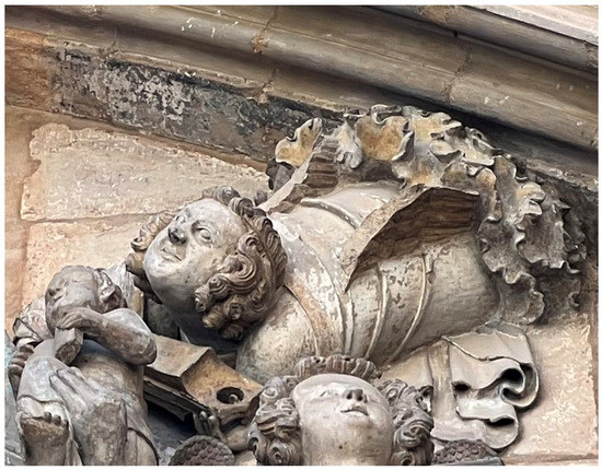 Flanking the Virgin overhead are two angels appearing down from two clouds with their wings now amputated. The one to the Virgin’s right is an angel playing a vielle resting on his shoulder (Figure 11). This instrument is a chordophone with handle. Its four simple strings are played with a bow. Its soundboard is a flat wooden box with two C-shaped sound holes. The waists are smooth and slightly pronounced to allow the bow to pass through. The neck, headstock and bow have not been preserved. The angel on the other side, above the infant Jesus, is playing a rare, unusual instrument in iconographic musical representations: a citole with keys (Figure 12). It is a short-necked chordophone that resonated via a wooden box tapering from the neck to the opposite end with a wedge shape, if looking at the instrument in profile. As mentioned, this instrument is peculiar in that it has five keys at the top of the neck. The citole is plucked with a plectrum or stroked with a bow. The left hand’s thumb is placed over a hole in order to grip the instrument’s neck and free the fingers to play. The citole achieved fame in the 13th century, appearing “in the doorways of churches and cathedrals built during the second half of the 13th century and subsequent decades. […] more widespread in the kingdoms of Galicia, León and Castile than in the rest of the peninsula” (Rey and Navarro 1993, p. 39). The top of the neck is no longer preserved. A priori, its organography seems to be a hybrid between a citole (in this case with holes in its sound box) and a five-key viola, though violas usually have the keys at the bottom of the neck to be easily played while stroking with the bow. One example can be found in a musical angel in the frescoes of the Capellina di Palazzo Pubblico in Siena (Italy), painted by Taddeo di Bartolo in 1408. The keys at the top of the neck generally appear in another medieval instrument, the organistrum, played with a crank at its lower end. Future investigations will shed more light on this, since it is currently very difficult to see the complete instrument without scaffolding.