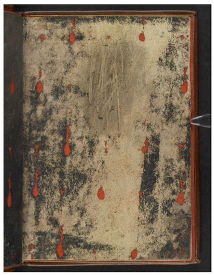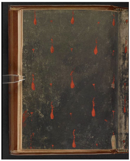 One of the most evocative and poignant examples of this is the lacerated and bleeding MS Egerton 1821. The MS Egerton 1821 is a devotional book written in a combination of English and Latin. It contains the Psalter and the Rosary of the Virgin Mary and several verses and poems, but it is also dominated by a strikingly explicit and graphic rendering of the wounded and bleeding body of Christ (Parshall et al. 2005, p. 185). The book commences with three pages painted all in black covered with big red drops of blood (f. 1r–f.2r) (Figure 1). The following pages contain an uncommon devotion called the five lilies of the Virgin (3r–5r). After this preparation of body and mind follows one of the most spectacular elements of the book: four folios—originally five—painted completely red on both the recto and verso and covered with hundreds of bleeding wounds in a darker red colour tone (Lowden 2007) (Figure 2). The wounds and droplets are painted in thick strokes with a shiny pigment that slightly elevates the drops from the page and makes them appear wet and fresh as if the skin of a body had just recently been breached to let the blood dripple out (f.6r–f.8r). The last three of these bleeding pages have woodcuts pasted onto them, on top of the red and wounded skin. All three of them are explicitly sanguinary, one (f.8v) showing the Man of Sorrows (Figure 3), the second (f.9r) depicts the five wounds of Christ dispersed around a cross (Figure 4) and the third (f.9v) shows the heavily bleeding figure of Christ standing by the cross with the sponge and lance (Figure 5). The rest of the book returns to the Virgin Mary, the Mother of God. First, there are instructions on how to perform the psalter of the Virgin including invocation of various saints (19v–27v). Then follows the Psalter itself (f.28r and v), the De Rosario beate marie virginis introduced by a poem (ff. 29r–39v), an explanation for the five lilies and further instructions for the praying of the rosary (39v–44r) as well as an instruction on an alternative way of praying the psalter (45r–59v). The book concludes with a cluster of verses on the Harrowing of Hell, the Resurrection and Ascension, the Assumption of the Virgin, the intercession, the Judgement, and other subjects (the final folio is 68v). The book constitutes an explicit and direct passion devotion folded into an emotive Mariological focus. The Egerton volume represents a dramatic and appealing combination of sweet meditations on the body of the holy mother and fervent, hypnotizing, and repetitive devotion to the bleeding body of her tormented son. With its excessive bloodiness, it is a highly evocative and emblematic case of the late medieval frenzy for blood (Bynum 2007; Bildhauer 2006a, 2006b). The present article will focus on the depiction of blood in the Egerton volume, focusing in particular on how the sanguine embodiment of the book serves to animate the book in the hands of the owner by using material, fluid, hyperreal, and mechanical strategies.