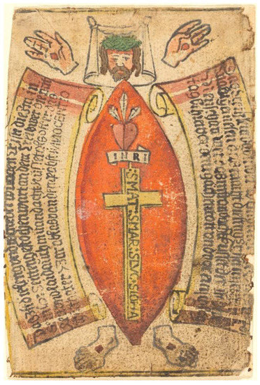 A prototypical example of the visualization of and interaction with the body of Christ as book is a German woodcut from a manuscript, c. 1484–92 (Figure 8). The woodcut depicts the body of Christ, not as a real body, but as a composition of pieces, like a puzzle, consisting of aspects of the passion: in place of the body is a huge blood-red wound inside which a cross and penetrated heart are depicted. In place of the head is the sudarium. Christ’s injured hands and feet float as detached members around the wound in the middle. On each side of the wound, the body of Christ has opened into two scrolls with descriptions of the devotional use of the woodcut. In the small woodcut, Christ’s body is a fragmented body, his members are divorced and parcelled out into readable signs of his passion, like graphemes or pictograms. Christ’s limbs are leaves to be read as a narrative of his passion. The left banderol states that “This is the length and width of Christ’s wound which was pierced in his side on the Cross. Whoever kisses this wound with remorse and sorrow, also with devotion, will have as often as he does this, seven years indulgence from Pope Innocent”. The right banderol reads “This little cross standing in Christ’s wound measured 40 times makes the length of Christ in his humanity. Whoever kisses it with devotion shall be protected from sudden death or misfortune” (trans. from Parshall et al. 2005, p. 259; see also Powell 2012, p. 179ff.; Areford 1998, pp. 211–13). The text addresses the trope of the Wounded Side as shelter and refuge for the soul, which was widespread in the period, and expressed among others by Aelred of Rievaulx in his De Institutione Inclusarum—“Crepe in-to that blessed syde where the blood and water cam forth” (Aelred of Rievaulx 1984, p. 22)—and Bernhard of Clairvaux in his Sermons on the Song of Songs: “The secret of his Heart is laid open through the clefts in his body; that mighty mystery of loving is laid open…God…has even led us by the open clefts into the holy place.” (Bernhard cited from McQuinn 2005, p. 96). But the woodcut also illustrates that the reading of the body-book was one of close intimate interaction that involved “contact of skin on skin” (Kay 2011, p. 13). Indulgence and protection were given only if the lips of the reader were devoutly pressed against the lesion of the Saviour, a gory full-size wound that appears on skin, and as skin in the middle of the fragmented and unfolded body. Measuring, counting, and sizing make the absent body of Christ present in a relic-like way, as Caroline Walker Bynum has argued, “to measure is to absorb the power of the measured self by contact with it” (Bynum 2011, p. 172). The print was a metric relic bound to the body of Christ by size, shape, blood, and skin (on metric relics, see Rudy 2015, pp. 209–15; see also Ritchey 2018, p. 171). The Egerton volume with its bleeding and lacerated pages should in a similar fashion be read, kissed, and touched like a body with leaves of flesh corrected, erased, punctuated, decorated, illuminated, and bound, ready to be opened and ruminated by the reader. But instead of presenting the reader with a living wound, it animated the living and bleeding skin of Christ.