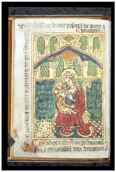 The very makeup of the medieval codex—with the text, written on animal cutis, resting between its covers—assures its revelatory promise, as does the body of the Virgin, which generates, conceals, nurtures, and reveals the incarnate Word behind the cover of her flesh […] The Virgin here becomes the cover and so the access point for the pious reader’s journey to her son.(Gertsman 2015, p. 44)