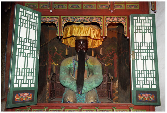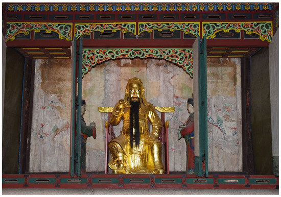 The late eighteenth and nineteenth century iconography of Kwanje dictated a figure seated in frontal pose, with a fierce-looking face with a dark red complexion, a three-pronged beard, and two jade belts. The Northern Shrine’s Kwanje sculpture, which had been commissioned by King Kojong 高宗 (1852–1919, r. 1907–1910) and Queen Min 閔 (1851–1895) in 1883, exemplifies this trend (Figure 3). It depicts a fierce looking Kwanje dressed in a royal dragon robe, seated in front of a symbolic landscape screen representing the universe. In the royal court context, the figure was further depicted with a winged coronet called iksŏngwan 翼善冠 and a red dragon robe, which sets the Korean iconography apart from late Chinese visual conventions that portrayed Guandi as a mighty warrior in a green robe over armor with a dark hood (Figure 4 and Figure 5). (Lee 2020, p. 204; Chang 2008, pp. 98–99).