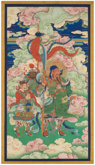 By the early twentieth century at the latest, Kwanje had developed into a major popular deity believed to cure sicknesses and bestow wealth. To combat “illicit cults” in Seoul in 1904, the police seized 3000 images of Kwanje from private residences. In addition to the official temples in Seoul, a Japanese researcher recorded 107 private shrines for Kwanje. Merchants in Seoul were among his most fervent worshippers and built small shrines for him near their markets. Guan Yu and other heroes from the Romance of the Three Kingdoms were also included in the pantheon of shamans (Walraven 2015, p. 217). Modern shamanic icons modeled after the traditional shamanic iconography of Kwanje accentuate his virility by showing him with a long, thick beard, a martial weapon, and headgear, but do not display any royal regalia (Figure 6). Kwanje’s flexible iconography is a perfect illustration of the various ways in which the visual lexicon of imported Daoist deities was re-calibrated in the Korean religious and political realm.