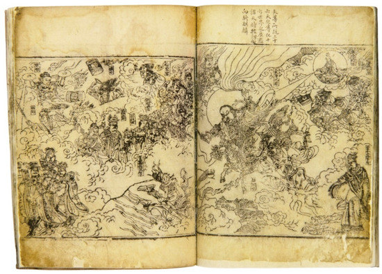Three annotated Chosŏn editions have so far been found in South Korean and Japanese library, museum, and temple collections. The Mt. Mudŭng Ansim Monastery (Mudŭngsan Ansimsa 無等山 安心寺) edition, printed in 1570, is the oldest; followed by the Mt. Myohyang Pohyŏn Monastery (Myohyangsan Pohyŏnsa 妙香山 普賢寺) version edition produced in 1733, and the Mt. Kyeryong (Kyeryongsan 鷄龍山) edition, printed in 1888.15 With the exception of the absence of a frontispiece in the Korean versions, the Chosŏn editions have a comparable pictorial arrangement that appears to reflect earlier Yuan and Ming editions like the copy in the British Library’s collection (acc. no. 15103.aa.2) (Little and Eichman 2000, pp. 237–39; Wan 2010). A total of 33 illustrations depict a Daoist master’s visualization journey to heaven, followed by eight pages depicting talismanic seals that might have been written or used in the visualization. The postscripts list the names of several dozen donors (mostly laypeople), fundraisers, carvers, as well as the print’s production date and location.