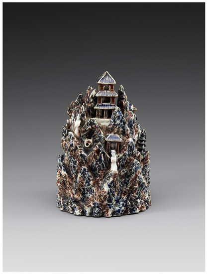 One kind of tangible object used to portray an otherworldly land was a water dropper shaped like a universal mountain (paksan 博山). Such water droppers probably allowed late Chosŏn cultured individuals to experience a brief spiritual escape while engaging in literary pursuits. The National Museum of Korea has an exceptional example of such a water dropper in their collection (Figure 9). Dated to the nineteenth century, it was made from high-quality porcelain, shaped like a steep cone, with cobalt blue and copper red painting in underglaze accentuating the tips of the peaks. According to the current scholarship, this type of water dropper is believed to represent Kŭmgangsan. However, due to its formal features it seems more plausible to me that it is a small representation of an unspecified otherworldly mountain with transcendent beings standing between and on top of its pointy, triangular peaks, similar in shape to the ancient Chinese form known as boshanlu 博山爐 (universal mountain incense burner), and reminiscent of Korean depictions of mythical landscapes such as An Kyŏn’s 安堅 (act. 15th century) Painting of a Dream Journey to the Peach Blossom Land (Mongyudowŏndo 夢遊桃源圖) (cf. Lee 2018, p. 130).