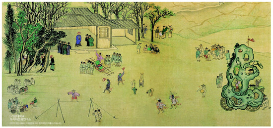 In one of his paintings from the album Illustrations of an Imperial Commissioner (Fengshitu奉使圖), Akedun 阿克敦 (1685–1756), a Qing (1636–1911) Chinese envoy who visited Korea in 1725, depicts a sandae stage (Figure 10) (Chŏng 2005, p. 218). Based on sketches he commissioned from a Korean artist, Akedun’s detailed depiction of the scene captures the moment when two men (possibly members of the sandae togam troupe) wheeled a several-dozen-feet tall, bizarrely shaped artificial rock mountain to the outdoor stage. Niches inside the rock feature painted clay figurines of a female wearing a fancy, bright red skirt, as well as a monkey and an angler. Green-leaved twigs and branches adorn the rock, evoking the natural characteristics of mountain scenery that suggests an imaginary otherworldly land. While the Special Record about Odd Amusements refers to sandae as a representation of Mt. Kŭmgang that was used as a stage to perform the tale of Kim Man-jung’s 金萬重 (1637–1692) Cloud Dream of the Nine (Kuunmong 九雲夢), Akedun’s album leaf demonstrates the use of sandae as a backdrop which enhanced the visual impact of various performances that took place in front of it, including mask dance, plate spinning, and tightrope walking. Framed by small groups of onlookers of varying age, gender and social status, the scene contributes to our understanding of the extent to which Daoist-(and Buddhist-)infused performance arts attracted a wide range of people in the late Chosŏn (cf. Sa 2002, pp. 358–61, 374).