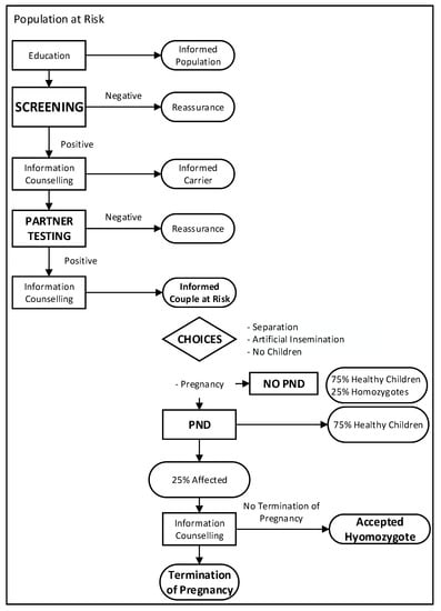 Prevention of inherited diseases relies on genetic counselling, defined “as the process of helping people understand and adopt to the medical, psychological and familial implications of genetic contributions to disease” (Bittles 2012, chp. 18, p. 204).11 Genetic counselling is required as part of genetic screening (Figure 1 (29)), that is, pre-marital screening (PMS) or pre-natal diagnosis (PND).