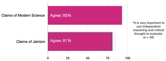 Further, the value of individual reasoning in negotiating conflicting knowledge systems is highly valued among the Jain medical professionals. Respondents believed it was “very important to use independent reasoning and critical thought to evaluate” both the claims of modern science (93%; n = 42) as well as the claims of Jainism (81%, n = 42; Figure 3).