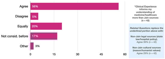 Survey Question: “Clinical Experience informs my understanding of medicine/healthcare more than Jain sources: (n = 42)”.