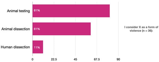 As noted above, all the survey respondents practiced some form of Jain vegetarianism in their dietary commitments, reflecting the tradition’s strong aversion to harming five-sensed beings for food. Respondents also expressed considerable agreement on their discomfort with animals used in medicine. The majority of respondents agreed that animal testing is a form of violence (81%, n = 36). Likewise, a majority considered animal dissection for educational and/or research purposes a form of violence (61%, n = 36)—versus only eleven percent who felt dissection of human cadavers constituted a form of harm (Figure 5).
