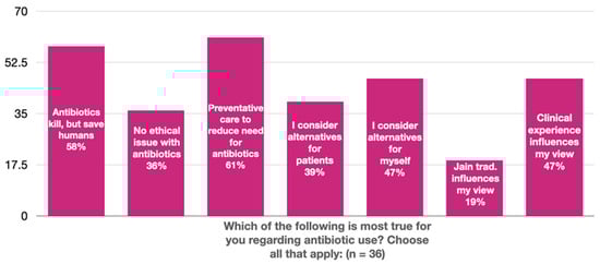 Likewise, when asked to elaborate their position on antibiotics, respondents acknowledged that antibiotics—while killing one-sensed organisms—were sometimes necessary to save human life. A greater number, however, emphasized preventative care to reduce the demand for antibiotics (61%, n = 36) and (58%). Therefore, according to this chart, while a sizeable minority did not see any ethical issues in using antibiotics (36%, n = 36), a greater number of participants considered alternatives to antibiotics when prescribing patient care (39%), as well as in their personal healthcare (47%; Figure 7). Interestingly, more respondents stated that they would accept antibiotics (36%, n = 36) as a form of Life Sustaining Treatment more than all other listed interventions such as blood transfusion (31%), dialysis (28%), and CPR (25%), among others, although this data likewise suggests that more than sixty percent of respondents may not accept antibiotics when the end of life is evident.