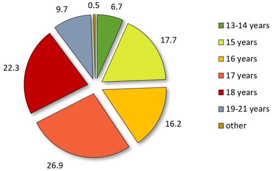 The study was conducted between September 2019 and June 2020 by the CAWI (Computer-Assisted Web Interview) method on a population of grade 7 and 8 primary school students (single structure education covering both ISCED level 1 and 2) and secondary school students (ISCED level 3—upper secondary general and secondary vocational schools) in Poland aged from 15 to 20 years. From school year 2019/2020 those students who have graduated from 8-year primary school enter upper secondary education at the age of 15. There are three types of higher secondary schools in Poland: 4-year high school, 5-year technical school and 3-year vocational school. Students can choose one of them within the compulsory education up to the age of 18 (cf. ). The age of the respondents is illustrated in Figure 1.