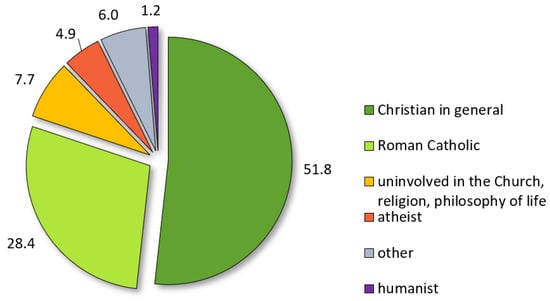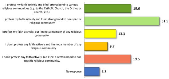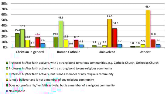The largest percentage of the declared Christians in general (52.0% of the total study population) responded that they professed their faith actively and felt a strong affiliation with a specific religious community (32.9%). A little smaller percentage of them (25.4%) were those who professed their faith actively and felt a strong bond to various religious communities (e.g., Catholic Church, Orthodox Church, etc.). Moreover, 18.9% of the respondents declared not professing any faith actively but felt a certain affiliation with one specific religious community. Probably, in some cases, those are non-practicing or hardly practicing believers. It is notable in this context that 13.5% declared not to be members of a religious community while professing their faith actively. They must be respondents whose faith and religious practices have an individual and subjective dimension. They value their autonomy and freeing themselves from the influence of tradition. The attitudes of the others are more stable. Only among the Roman Catholics is affiliation with a group unrelated to professing one’s faith actively high enough (12.7%) to indicate that it satisfies the need for social belonging and acceptance, and this is seen by this group of respondents in the church community. A relatively small percentage (1.8%) of the declared Christians in general did not profess any religion actively and were not members of any religious community. In some cases, these are certainly respondents who—despite having been baptised—do not identify themselves with faith and they do not want to publicly declare their affiliation with a religious community. This is different from declared Catholics (28.0% of the total study population). In this case, a definitely larger percentage (48.5%) are those who declared that they professed their faith actively and felt a strong bond to one specific religious community. At the same time, 19.0% of this study group declared professing their faith actively and felt a strong bond to various religious communities (to the Catholic Church, the Orthodox Church, etc.). Furthermore, 13.9% of Roman Catholics declared professing their faith actively while not being members of any religious community. This may indicate that the phrase “religious community” was considered by the responders not to be synonymous with “official religion” but rather to be identical with small religious groups and/or movements within the certain religious organisation. It is interesting that 12.7% of the declared Roman Catholics did not profess any faith actively, but they felt a certain affiliation with one specific religious community. These are certainly non-practicing individuals. It is also notable that 4.8% of the declared Roman Catholics did not provide any response, and 0.9% claimed not to profess any religion actively or to be members of any religious community. This latter group of respondents can be perceived as religiously indifferent individuals. The responses of religiously uninvolved individuals (8.0% of the study population) are also noteworthy. Over half of the respondents (51.7%) in this group declared not to profess any religion actively and not to be members of any religious community. Far fewer of those religiously uninvolved (34.5%) responded that they did not profess any faith actively but that they felt a certain affiliation with a specific religious community, which indicates their indecisiveness, non-established convictions but inclined somehow to seek for a kind of religiousness. Only 3.4% of religiously uninvolved respondents declared that they professed their faith actively and that they felt a strong affiliation with various religious communities (e.g., the Catholic Church, the Orthodox Church, etc.), and the same percentage (3.4%) responded, “I profess my faith actively and I am not a member of any religious community”. The fewest religiously uninvolved respondents (1.1%) declared that they professed their faith actively and they felt a strong bond to one specific religious community. The religiously uninvolved individuals who did not provide any response accounted for 5.7%. These data do not in any way indicate an advanced process of individualisation and pluralisation of religion. They suggest that also for young, religiously uninvolved people, faith and affiliation with a religious community become an object of important, individual considerations, leading to individual choices and preferences. It is also notable that 68.4% of the declared atheists did not profess any faith and were not members of any religious community. Such declarations are justified, and they arise from the very essence of atheism. At the same time, 14.0% of the respondents in this study group declared not to profess any faith actively but did feel a certain affiliation with one specific religious community. This may come from family and/or social traditions. There are some puzzling responses in which declared atheists responded that they professed their faith actively and that they were not members of any religious community (5.3%), they professed their faith actively, and they were strongly bonded to various religious communities (1.8%). Self-declarations may be a manifestation of the lack of consistency between one’s inner convictions and attitudes, and a full explanation would require further studies. The rate of the lack of response is also notable (5.3%). Possibly, the respondents in this group have some problems with justifying their self-declarations.