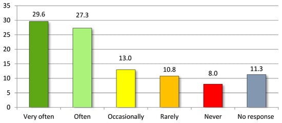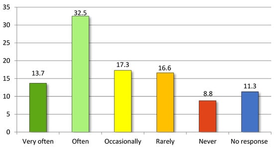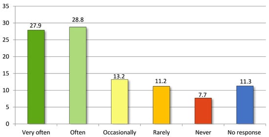 Practicing believers account for 56.9% of the whole study population, including 29.6% who declared that they attended religious services on major holidays (understood as holidays regarded as the most important ones in a specific religious tradition) very often, and 27.3%—often. Only 13% of the respondents attended religious services on major holidays from time to time, 10.8%—rarely, and 8.0%—never. As many as 11.3% of the respondents did not answer this question. Possibly, the young people taking part in the study—while experiencing a relatively strong bond with God and with the ecclesial community—do not abandon the obligatory religious practices en mass in favour of their individual preferences. This is probably affected by various social and cultural factors, especially one’s family situation. Therefore, the respondents were asked: do your parents attend religious services/celebrations/masses (in synagogue. church, mosque, etc.)? The answers are shown in Figure 9. According to this, 28.8% of the parents often go to religious services, 27.9% of them do it very often, 13.2%—from time to time, 11.2%—rarely and 7.7%—never, and 11.3% of the respondents did not respond. The respondents’ declarations about their parents attending religious services/celebrations/masses are diverse.