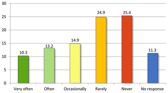 Interestingly, 24.3% of the respondents declared that their parents had never made them attend religious services/celebrations/masses, and 24.9% responded that they had done it rarely, while 14.9% of the respondents declared that their parents had made them attend religious services/celebrations/masses from time to time, 13.2% responded that they had done it often, 10.3%—very often, and 11.3% of the respondents did not answer. According to Figure 9, there are a total of 56.7% practicing parents (the sum of the “often” and “very often” responses). Figure 7 shows that there are 46.2% of practicing young people (very often and often). This gives a 10.5% deficit, which leads one to the conclusion that the example provided by parents is met with more effective neutralising tendencies, which include the impact of mass culture or other factors which were not analysed in this study. Moreover, Figure 10 shows that more than half of the respondents had not been made to attend religious practices (rarely + never = 50.3%). This means that the parents practicing and giving an example with their actions and religious education were more frequent than making young people attend religious practices. Therefore, one can conclude that the bond to religious traditions and practices is still strong in the south and south-east of Poland, i.e., the regions under study, especially in the generation of the respondents’ parents, although this bond diminishes in the vertical transmission. This tendency can be demonstrated in further studies.