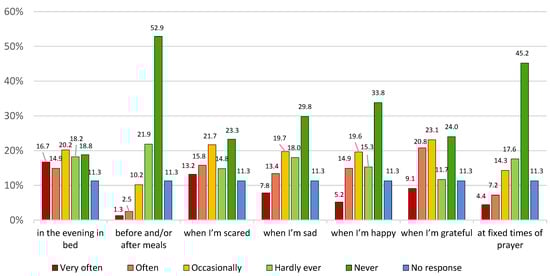 A total of 51.8% of the respondents pray in bed in the evening (20.2% pray from time to time, 16.7%—very often, 14.9%—often), 18.8%—never, and 18.2%—hardly ever. Praying was not associated with the meal ritual. 52.9% of the respondents never pray before and/or after meals, 21.9%—hardly ever, and 14.1% of them admit that they pray (10.3%—from time to time, 2.5% often, 1.3% very often). Fear is not a motive for praying for 23.3% of the respondents. It seems to be a very weak motivator for praying for 14.8% of the respondents who chose the “hardly ever” response. However, as many as 50.7% of the respondents pray when they are anxious or concerned, including 21.7%—from time to time, 15.8%—often, 13.2%—very often. Furthermore, 29.8% of the respondents declared that they never prayed when they were sad. However, as many as 40.9% of the respondents pray when they sad (19.7% pray from time to time 13.4%—often, 7.8%—very often). When they are happy, 19.6% of the respondents pray from time to time, 15.3%—hardly ever, 14.9%—often, 5.2%—very often. No praying when they were happy was declared by 33.8% of the respondents. Gratitude is a reason for praying for 53% of the respondents (23.1% pray from time to time when they are grateful, 20.8%—often, 9.1%—very often), 11.7% hardly ever pray in such situations, and 24.0% of the respondents never pray when they are grateful. Not praying at fixed times was declared by 45.2% of the respondents did not pray at fixed times and 17.6% hardly ever prayed. 14.3% of the respondents declared praying at fixed times from time to time, 7.2%—often and 4.4%—very often. As many as 11.3% of the respondents did not provide an answer in each category specifying the time and place of praying (like with the questions about attending religious services, about their parents attending such services and about their parents making them attend such services). The data show the young people’s highly diverse attitude to praying. A large majority of them pray for emotional and personal reasons (e.g., sadness, gratitude, happiness), with no fixed timeframe and with no link to meals. Therefore, it is more an individual than a community-related practice, usually with no link to home and family rituals.