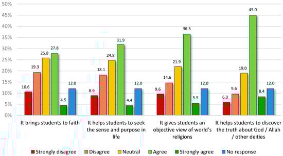 It is also worth pointing out the respondents’ opinions on whether religious lessons enable students to discover the truth about God/Allah/other deities. 53.9% of respondents agreed (including 8.4% definitely) that religious lessons enabled students to discover the truth about God/Allah/other deities, 19.0% were indifferent, 9.6% disagreed, 6.0% definitely disagreed that religious lessons enabled students to discover the truth about God/Allah/other deities. Twelve percent of the respondents did not give an answer in any category of options to choose from.