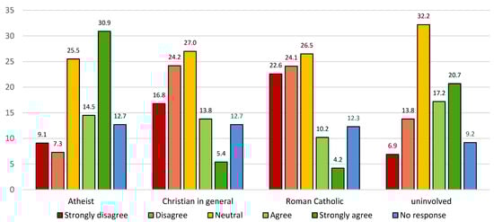 Affiliation with a religious community as correlated to a self-declaration of faith was the most marked among Catholics. As many as 68.4% of the respondents declaring themselves to be Catholics claimed to be members of a specific religious community and to attend religious services regularly. Only 4.8% of the Catholics under study do not need a specific religion or to attend religious services. This group also contains a puzzlingly high percentage (8.4%) of respondents who do not have to be members of any religious community, but they have to attend religious services regularly. A question arises: Is this caused by a certain type of traditional religiousness—“cultural obviousness”—inherited from one’s parents? May it be a consequence of a certain pressure from one’s parents or grandparents? The data in Figure 4 show that individuals with more established convictions belong to two polarised, opposite groups: Roman Catholics and atheists. This may indicate the tight-knit nature of the group of their fellow believers, sharing similar views, or greater confidence in the declared views (possibly together with a lower ability to establish open dialogue; however, this cannot be inferred from the study), as opposed to people with more flexible views, as Christians in general and the uninvolved, potentially more labile and prone to change those declarations. The latter can still hesitate about which side to choose—whether to join the others or to keep a distance. The responses of those who declared being uninvolved religiously are rather predictable—52.9% of the respondents claimed that they did not need a specific religion or to attend religious services. A much smaller percentage of the respondents—19.5%—do not have to attend religious services despite a sense of affiliation with a religious community (institution). Such declarations are justified in the group of uninvolved individuals. Further responses were surprising—11.5% of the religiously uninvolved respondents, who declared not being members of any religious community, also declared attending religious services regularly. 10.3% of the religiously uninvolved respondents declared to be members of a religious community (e.g., the Catholic Church) and attending religious services regularly (in a church or other shrine), which may be surprising. It seems that those declared to be religiously uninvolved, like Christians in general and Catholics, although to a smaller extent, choose what suits them best and treat religion like one of many activities to choose from.