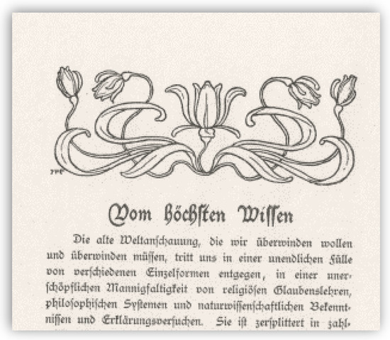 The central ideas of the Neue Gemeinschaft were disseminated in a journal titled Das Reich der Erfüllung (The Kingdom of Fulfillment) with the subheading (Flügschriften zur Begründung einer neuen Weltanschuung (“Pamphlets on the Establishment of a New Worldview”). The journal printed lectures and poems that grew out of the events. Most of the essays were penned by Julius and Heinrich Hart. Only two volumes appeared, published by the influential Eugene Diederich’s publishing house17 printed using a fine Fraktur typeface, with the different headings adorned by wood carvings of Fidus’s naturalistic illustrations of plants, branches, and flowers (see Figure 4) (Hart and Hart 1900, 1901). The different articles carry names like “Of higher knowledge” (Vom höchsten Wissen), “Of enlightened life” (Vom Lebens im Licht), and “For the consecration” (Zur Weihe). Thus, in every aspect of its appearance and in all its appearance, these pamphlets express the belief in a grander, truer, and more profound existence.
