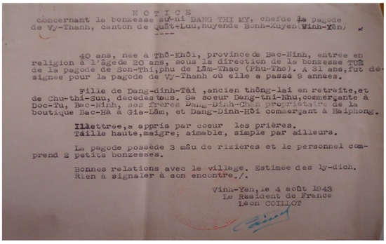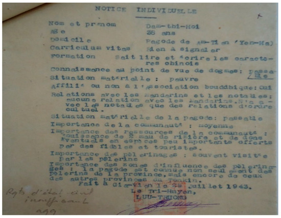 This article utilizes both Buddhist periodicals—which were established during the revival movement—and archival sources. Their purpose was to shed light on the differences in the nuns’ situation between the three regions during the colonial period, as well as to shed light on their voices within the context of the revival movement. Some examples of Buddhist periodicals are Pháp Âm (Voice Dharma, 1929), Phật Hóa Tân Thanh Niên (1929), Từ Bi Âm (1932–1945), Viên Âm (1933–1945, 1949–1953), Duy Tâm Phật Học (1935–1943), Đuốc Tuệ (1935–1945), Tam Bảo (The Three Jewels, 1936–1938, Annam), and Tiếng chuông sớm (Sound of Early Bell, 1935–1936). By surveying this collection of periodicals, we found 56 articles written by nuns. Regarding archival materials, we consulted the documents at the National Overseas Archives (Aix-en-Provence, France) on the collection of GGI (Gouvernement général d’Indochine) and RSTNF (Résident Supérieur du Tonkin Nouveau Fonds). At the National Archives Center I, Hanoi, we consulted the collection of GGI (Gouvernement général d’Indochine), RST (Résident Supérieur du Tonkin), and MHN (Mairie de Hanoï). At the National Archives Center II (Ho Chi Minh City), we investigated the collection of Goucoch (Gouvernement de Cochinchine). Lastly, at the National Archives Center IV (Da Lat), we focused on the collection of the Central Vietnam governors. Thanks to these archives, we were able to find records of Buddhist associations, pagodas, and surveys on the activities of Buddhist associations. During the survey, we found two dossiers: 2405 (collection of RSTNF, Archives Nationales d’Outre-Mer, France) and 3722 (collection of MHN, National Archives Center I, Hanoi, Vietnam), which concern nuns in Tonkin. Among them, dossier 2405 is a very important and meaningful record (Archives Nationales d’Outre-Mer 1943). Indeed, it mentions Notices individuelles sur les chefs de pagodes (individual instructions on the chiefs of pagodas) secretly made in 1943 in the provinces of Tonkin by the French authorities. Each instruction has the following basic information: name; age; address; educational and Buddhist background; membership in the Tonkin Buddhist Association; relationship with officials and relatives; religion; material status; the importance of the monastery; its wealth; the degree of influence of pagodas; and the number of members, i.e., from the abbots to the followers. Underneath each instruction is the signature and seal of the village mayor lý trưởng, or district chief tri huyện, or French resident công sứ. The instruction below [Figure 1] allows us to visualize the specific information that was outlined in the file: