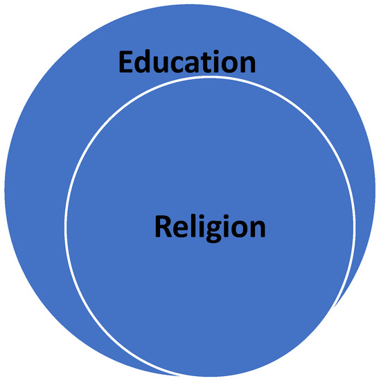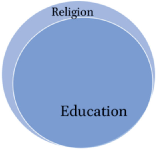 Religious education is defined differently depending on the religious landscape of the country in which it is practiced. The features of a country’s religious landscape include the role and value of religion, the relationship between the state and religion, and the history and politics of the school system and its divisions (Schreiner 2002). Religious education is broadly defined as the teaching of a set of beliefs, practices, narratives, written traditions, and values about the sacred and the relationship of members of a faith community to God. These elements may include transcendental doctrines, traditional stories, myths, sacred rituals, and ethical codes (Gross 2011). The literature differentiates between education into religion, education about religion, and education from religion (Schreiner 2002; van der Kooij et al. 2017). Education into religion means the cultivation of students’ religious identities to mold them into believers and members of a specific religious tradition. This kind of education is referred to here as communitarian. The following Figure 1 represents this idea of religious education: