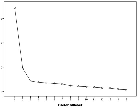 The indices of the appropriateness of the data for factor extraction confirmed the adequacy of the sample to conduct such analysis. The Kaiser–Meyer–Olkin statistics showed a value of 0.911 indicating no problem with the sample size. The Bartlett Test of Sphericity of all fifteen items displayed acceptable correlations to continue the factorial analysis (χ2 = 1817.448, df = 105, p < 0.001). The EFA with the maximum likelihood (ML) estimation (unforced promax rotation) showed two components with eigenvalues greater than 1.0 which accounted for 58.5% of the variance. The graphical presentation (a scree plot) also suggests a two-factor solution for the CRPQ (Figure 1).