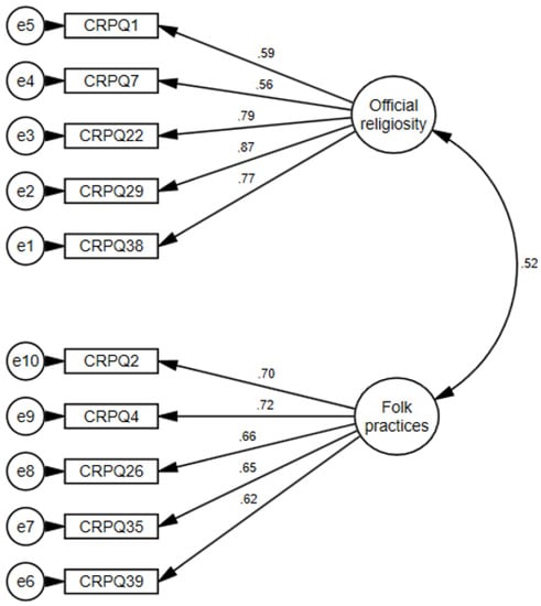 Considering that the phenomenon of folk practices constitutes a multifaceted concept, we also tried to explore an alternative three-factor model. Although the loadings of the third factor that we called popular faith (CRPQ35 and CRPQ39) were satisfactory (between 0.66 and 0.78), the loadings of the two other factors decreased (two loadings were under 0.55). Moreover, the covariance between folk practices and popular faith exceeded 0.86, thus suggesting discriminant validity issues. The goodness-of-fit showed that the three-factorial model consisting of official religiosity, folk practices, and popular faith represented the data less adequately than the two-factorial model: CMIN/DF = 3.081; GFI = 0.87; TLI = 0.88; CFI = 0.91, SRMS = 0.07; RMSEA = 0.11; LO = 0.09; and HI = 0.13. Based on the results obtained, the two-factor model was accepted in its initial form.