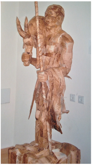 Tesfaye Tegegne creates sculptures out of materials such as industrial paint, glues, polystyrene, and iron, which he integrates with banana leaves. This combination of materials raises questions about the connections between modern technology and traditional modes of work, and meticulous, labour-intensive handiwork based on years of professional practice. In his sculptures, the artist also alludes to geographic places bound up with an agrarian society and a distinctive lifestyle. For his third solo exhibition in Israel, for example, Tegegne created a large sculpture of a man returning from the hunt. The figure, crafted from polystyrene and industrial glue, sheathed in banana leaves and resting on a square iron base, appears to be walking while carrying the animal he has slain (Figure 1). The label placed next to it in the exhibition galley reads: ‘This artwork was inspired by my childhood memories from Ethiopia. A group would go hunting and return with their kill to show the villagers their courage. In this sculpture, a hunter is carrying the dead prey on his way to receive a blessing from his father, as is customary in Ethiopia.’