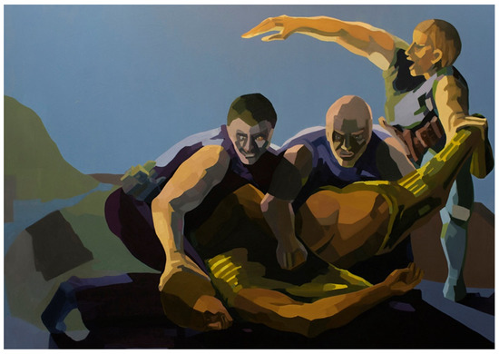 The repeated incidents of police violence against Ethiopian-Israelis led to a spectrum of artistic representations of this state of affairs. A series of paintings by Nirit Takele, for example, captures Ethiopian-Israeli men in such situations, particularly during protests. Untitled (Beating of the Israeli Soldier) is a 2015 painting, based on a true incident, depicting three light-skinned policemen pinning down a young black man (Figure 3).