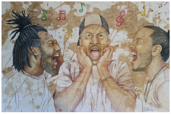 When Elazar Tamano made a painting of three members of the Ethiopian-Israeli band K.G.C. and posted it on Facebook on 20 December 2015, he wrote: ‘Good week, beautiful people…The year of 2015 is coming to its end. Each one of us has a unique way to sum up the passing year, I have my art to express what I went through this year. So, a second before this beautiful year comes to an end, I want to share with you the project “My Painting’s Playlist”, a project in which I draw portraits of the singers that I listen to while I’m painting. So K.G.C., thank you for all the powerful words and the amazing muse’ (Figure 5).