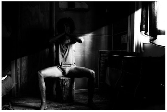 This artist who identifies as an Ethiopian-Israeli gay man, shot a series of black-and-white photographs of his own body. One photo represents him wearing an undershirt and shorts, seated in the middle of a room with minimalist, modest furnishings (Figure 8).