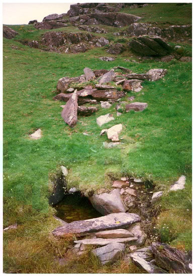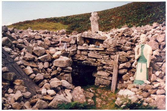 In Ireland any part of the land—mountains, hills, lakes, islands, valleys, plains—can be a destination of the pilgrimage. In almost every lake is a holy island. The latter are also scattered around the coast, very often with the remains of early Mediaeval monastic settlements on them which are the objects of veneration. A holy well, sometimes even more than one, can be found in almost every place of pilgrimage in any kind of location, even at least expected, like the bottoms of cliffs, caves, mountain tops and passes, hills, bogs, and seashores. In the latter case, holy wells may sometimes be covered at high tide by the waters of the sea. Similarly, the wells at lakes and rivers may also be covered by their waters. The periodic union between the salt and fresh water of the wells at the sea is perceived as the symbolic union of “the Great God and Goddess”, therefore wells were associated with fecundity. “Serpent eggs” (stones) were brought to them by women who wanted to become pregnant (Brenneman and Brenneman 1995, p. 37). At the beginning of the nineteenth century, there were at least 30004 holy wells in Ireland (Plummer [1910] 1968, p. cxlix).