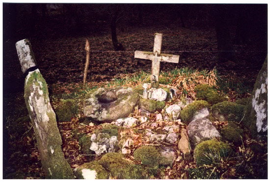 A small stone may be placed also on the stone slab, like that in the precinct of the largest of the ruined churches at St. Mullins (Co. Carlow). It was still done in the nineteenth century after each of the nine rounds of the slab (O’Hanlon in Logan [1980] 1992, p. 28). The pilgrim may leave some offerings on the heap of stones,27 especially when it is considered to be the altar. Rosary beads, little devotional images and cards, buttons, the linen variety, clasps, brooches, pipe bowls, and money were left after praying in the crevices of the large rock called St. John’s Stone near Drumcullin Abbey (Co. Offaly) and on the ground around it. The pilgrims believed that their sins were left behind (Logan [1980] 1992, p. 101). Again, we encounter here sympathetic magic due to the transfer of specific human characteristics to the object.