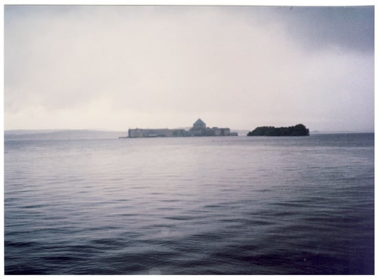Traditionally, the pilgrims did the pilgrimage barefoot. The practice of walking barefoot, or on the hands and knees, around the well, a tree, a stone or a heap of stones while praying, can be found described by writers in the nineteenth century. Croagh Patrick (Co. Mayo) (Figure 3) was climbed “bare from the waist up, even on the coldest days” (Hughes 1991, p. 64). According to Logan ([1980] 1992, p. 16), walking barefoot was meaningful as “a pair of boots was a status symbol”. He also added that this was done in the summer. However, even today, and not only in the summer, barefoot pilgrims can be spotted. I saw a man with bare feet who had just completed the stations on Croagh Patrick in 1996. The pilgrims who come to the Station Island in Lough Derg (Co, Donegal) (Figure 4) for the three-day pilgrimage, take off their shoes as soon as they arrive there and put them on again when they are about to leave (Curtayne [1944] 1980, p. 122). Bare feet are a sign of reverence and respect for the presence of God, and for the holy place. Taking off the footwear can be also perceived as a symbol of shedding “all those externals that make up status and lend importance to the individual: house, family and dependants, atmosphere, daily occupation”. If the pilgrim is “a personage in his ordinary life, he undergoes an immense leveling and becomes just one of the crowd” (Curtayne [1944] 1980, p. 132).