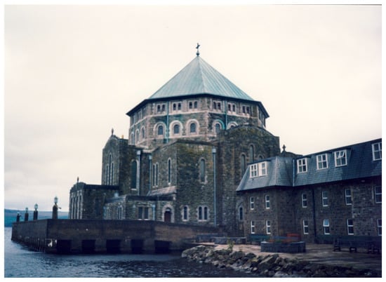 The rounds are made always clockwise20 (sunwise direction—Ir. deiseal), except the intention of placing a curse (to which I come back later) and the rounds of the Stations of the Cross in the new St. Patrick’s Basilica (Figure 6) on Lough Derg (cf. Pochin Mould 1955, p. 76). Sunwise direction was probably related to sun-worship (following the track of sun) replaced by Christianity with Christ—the new, true Sun (cf. Wood-Martin 1895, pp. 145–47; Pochin Mould 1955, pp. 57, 61; Streit [1977] 2001, p. 104). Further implications of deiseal led Daphne D. C. Pochin Mould (1955, p. 72) to view its meaning as: “the right way of doing […] therefore regarded as lucky”, and “the turn of blessing and the bringing of good fortune”. She also suggested that: “The walking sun-wise round […] has a practical purpose. It keeps the crowd moving, and for order, they must all move in the same direction”. Additionally, traditionally, walking barefoot often on the rough ground at night was to keep the pilgrims awake (Pochin Mould, p. 61).