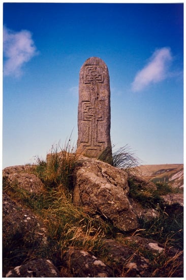 Usually there is a third element of the sacrus locus beside a well and a tree, namely a stone. This combination is very symbolic; it refers to the cosmos (Brenneman and Brenneman 1995, p. 67), to the union of male (all-father) and female (all-mother) represented by the tree-phallus (tree of life) and the life-giving water coming from the mother-earth. A female symbol was also a perforated stone (Long 1930, pp. 85–86). In the pagan Celtic world, but not only, it was believed that the stones possessed supernatural powers (cf. Ross 1970, p. 148). Stones at the well or nearby may mark the pilgrimage stations. There are different kinds of stones: rough upright pillars or carved (with various crosses or other Christian motifs, e.g., Christ, dolphins) (Figure 9); famous Celtic high crosses beautifully decorated (cf. Streit [1977] 2001); ordinary boulders, slabs. Many of them are believed to represent something, e.g., the head of St. Brigid near the old church in the parish of Outeragh (Co. Leitrim), although the examination conducted in the 1970s revealed that the face was bearded (Logan [1980] 1992, p. 22). In Clonmacnoise (Co. Offaly), there is a stone with a face carved on it which the pilgrims used to kiss. Since the place is connected with St. Ciaran, it can be assumed that the face is believed to be his. The head stones associated with the well were believed to activate “the power of the well that gives forth wisdom, fecundity, and prophecy” (Brenneman and Brenneman 1995, p. 55). The pilgrim may pray, also while kneeling, at the stones, bow to them, or walk around them while praying.