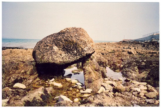 On the pilgrimage route in Glencolumcille there is a boat-shaped flagstone called Umar Ghlinne (the Trough of the Glen). Many pilgrims wash their feet with the water from it which is “reputed to have curative powers” (Herity 1998, p. 23). Lying in St. Molaise’s bed on Devinish Island (Co. Fermanagh), which is a stone trough, and reciting several Ave Marias was believed to cure a pain in the back. Similar efficacy was expected from: a large stone in the ancient cemetery in Clonmacnoise (Co. Offaly) on which the afflicted person sat; the stone near St. Columcille’s Well at Gleneaney (Co. Donegal) into which concavity the sufferer pressed his/her back; Leac na nDrom (the Stone of the Backs) on the top of Mount Brandon (Co. Kerry) against which the pilgrims pressed their backs31 (Logan [1980] 1992, p. 81). A pillar stone near St. Adamnan’s Well at Temple Moyle (Co. Donegal) was also believed to have curing power. The pilgrim rubbed the afflicted part of the body against it. The stone had already been destroyed at the beginning of the twentieth century (Logan [1980] 1992, p. 102). St. Kevin’s Stone—“a big erratic of conglomerate”—in Ardmore (Co. Waterford) (Figure 10), is raised above the ground enabling pilgrims to crawl under it. It was renowned for curing rheumatic complaints, “but it is said to be impossible to anyone in a state of mortal sin” (Pochin Mould 1955, p. 77). This may be a reference to the Bible parable about the problem of the rich man, as “It is simpler for a camel to go through a needle’s eye, than for a man of wealth to come into the kingdom of God” (Mk 10: 25).32 The treatment would also be in vain if the pilgrim had on him/her anything borrowed or stolen.