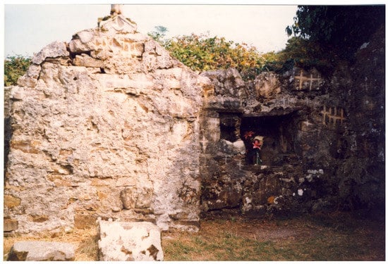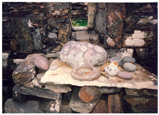 The turning of the stone was very often preceded by fasting and praying to God through the intercession of the saint at home; in the case of Caher Island (Co. Mayo) it was St. Patrick and “the saints, who had blessed the stone” (Harbison 1991, p. 228). Then, the person performing the ritual went to the Island to carry out the ritual there with the famous Leac na Naomh (the Saint’s Stone). When I was on Caher in 1996, the stone was still there on the altar of the ruined church (Figure 11), but I do not know whether the stone was still used at that time. On Inishmurray were two37 hollowed stones with smaller ones placed in the hollows used as cursing stones. The islanders preferred to call them Clocha Breacha (the Speckled Stones) as a precaution. Here, a nine-day fast was observed and then they were turned against the sun (Heraughty 1982, p. 29). They might have been turned sunwise to bless (Pochin Mould 1955, p. 75).