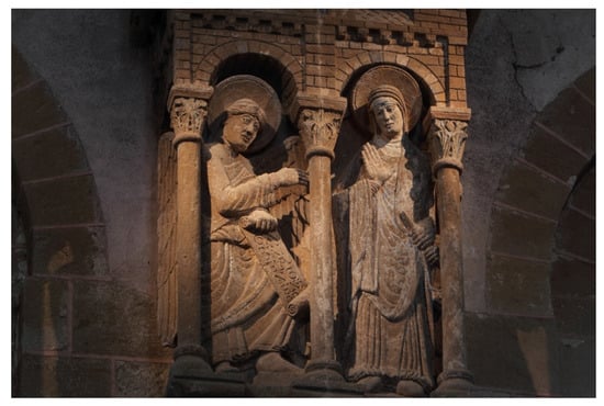 - Deschamps, Paul. 1941. Études sur sculptures de Sainte-Foy de Conques et de Saint-Sernin de Toulouse et leurs relations avec celles de Saint-Isidore de Léon et de Sainte-Jacques de Compostelle. Bulletin Monumental 100: 239–64. [Google Scholar] [CrossRef]