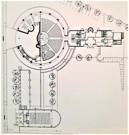 We can suppose that Dahinden took inspiration from the concentric orbits of the planets in the solar system, and it transformed into a sort of way to initiation before reaching our destination on an unusual spiral path, compared with the traditional ones along the church aisles. The circular shape of the plan and the slightly sloping floor toward the altar foster a sense of protection, which encourages participation in the ritual in progress (Figure 5). The inner disposition respects the tendency that had developed in Italy since the 1960s to abandon the usual elongated gallery, in which the celebrant and the believers were opposite each other, while it is in favor of them sitting around the presbytery (Benedetti 2000, p. 107). As a proof of this tendency, the Italian architect Glauco Gresleri observed that every person entering during the celebrations could be immediately recognized by the other worshippers (Gresleri 2021)10. In fact, the arrangement of the benches creates a sort of an amphitheater with the altar as a focal point, and the singular member can be perceived as part of the community itself. Everything let us feel in harmony with ourselves in a genuine and communitarian dimension (ἐκκλησία). Even the light and the water that are integrated in the composition assume universal meanings, almost as if they are antidotes to the dull modernism, which often rules out the natural forms.