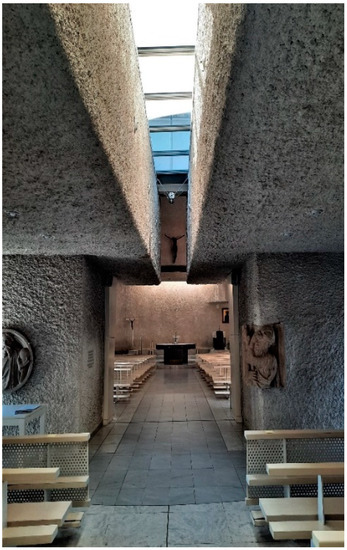 Moreover, thanks to his extensive practice in planning, he was aware of the anthropological quality of architecture as a holistic service to the believers. Humanity and spirit were highly taken into account by him. Modern churches had to express an exhortative message rather than be awe-inspiring; the old symmetrical rigor and the common overabundance of decorations would repel devotees instead of attracting them (Dahinden 1987, p. 43). Dogmatic architecture no longer served for prayer, but it had to be a welcoming shelter, a place of stasis from the daily frenzy.