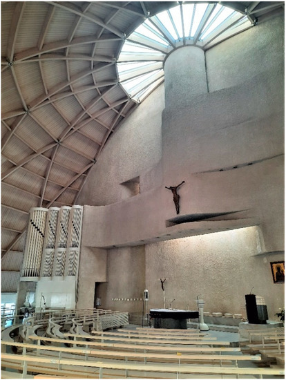 Justus Dahinden tried to convey the sense of community through the organic research that departed from the usual forms of traditional architecture. He proposed a particular way of approaching the divine, inspired by the latest trends and provisions in the design field. Truthfully, the post-conciliar strategies renovated the relationship between the priest and the assembly, which was supposed to feel like the protruding of God during the Eucharist. Everyone actively takes part in the mass (participatio actuosa), and the celebrant no longer turns his back on them as in the past, since the altarpiece is clearly visible in the central point of the hall, not anymore leaning against the back of the nave in the presbytery (Benedetti 2000, pp. 107, 190). With just some gestures, the architectural conscience aimed at expressing the symbolic meaning as well operating in depth. In this way, the direct relationship between the assembly and the celebrant takes place (Santi 2020). Potentially, the space itself could give the necessary strength to the believers to aspire to holiness and fully grasp the message of an evangelical mission. The Belgian theologian Frédéric Debuyst depicted the transition to Modernity as follows: