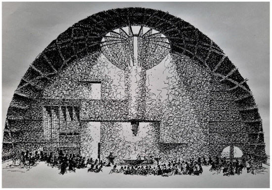 Actually, the drafts, the executive drawings and the photographs taken during the construction of the building witness his propensity to model the reinforced concrete as an authentic plastic composition, which is later covered by whitewashed plaster. The sinuous choir wall is the only load-bearing element in the construction. It is literally the “cornerstone” on which the entire temple stands, so it has a metaphorical meaning and exudes a rare expressive quality. It does not only separate the outside from the inside, but the protuberance behind the altarpiece incorporates and protects the tabernacle, and the celebrants’ seats are integrated into the perforated surface, too. During the day, the solar light passes through the glass roof above the bay, while light sources are hidden from the worshippers’ point of view, with the aim of giving prominence to the Holy Mystery rising from the sky. Inside the space, this wall contributes to producing an internal landscape, as it evokes three-dimensionality on its own. It almost appears to “come to life”, with a kind of “wave” defining the choir area and constituting the tribune leaning against the white organ (manufactured by the Mascioni company in 1997), which became relevant after the Second Vatican Council, as musical accompaniment became an important instrument for the celebrations (Benedetti 2000; Verdon 2008, p. 350). By resorting to this solution, the upper part of the wall ends with a cylinder-like volume marking the highest point of the structure, like a stylized spire or a telescope. It resembles the provision of a wide fixed curtain covering the community, from which a series of “tie rods” supporting the structure unravels and forms the woodwork ribs. Precisely at the point where they hinge, a crescent skylight (or oculus for the telescope) opens, through which zenithal light slides along the rough surface of the underlying wall, giving an intense atmosphere to the composition (Figure 6).