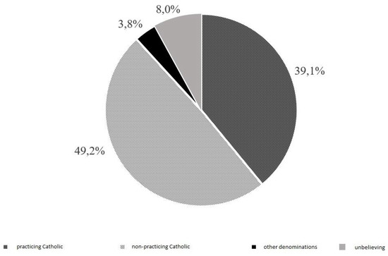 The basis for the development of conclusions in this article was the methodology of qualitative desk research analysis. In order to verify the hypotheses posed in the article, a survey research methodology was carried out. The empirical material was obtained from primary sources, which were people from different age groups and of a different faith. In the quantitative study devoted to the evaluation of the image of the Catholic Church, 425 people took part, 88.3% of whom were Catholics (see Figure 1). The survey was conducted during the COVID 19 pandemic which made access to respondents difficult. In total, 74% of the respondents were women, among the respondents in terms of the place of residence, the largest number of respondents came from the countryside (39%). Taking into account the age structure, the study group consisted of people aged 18–30 (35%). Most of the respondents had secondary/vocational education (58%) (Table 1, Table 2, Table 3 and Table 4).
