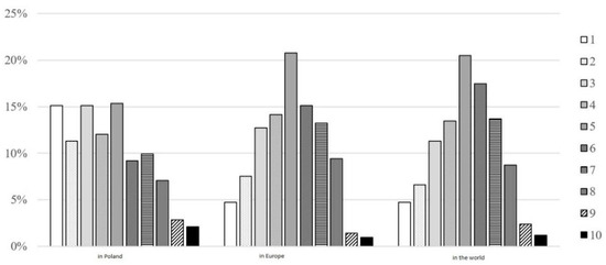 The assessment of the image of the Catholic Church in Poland was accompanied by an assessment of the Catholic Church in Europe and worldwide (see Figure 2). These assessments were strongly correlated with each other (see Table 1). The distributions of the results of the assessments in Europe and worldwide are characterised by a much weaker asymmetry and lesser variation—2/3 of the assessments fall within the range of 3–7, extreme assessments appeared much less frequently than in the case of the image of the Catholic Church in Poland. The non-parametric test for the three dependent samples indicates statistically significant differences between the distributions of the scores of the Catholic Church in Poland, Europe and worldwide (p value < 0.001 in the Friedman two-way variance test). On the other hand, parametric tests for means in the dependent samples (see Table 5) indicate that the mean scores for the image of the Catholic Church in Poland are significantly lower than the mean scores for the image of the Catholic Church in Europe and the world.